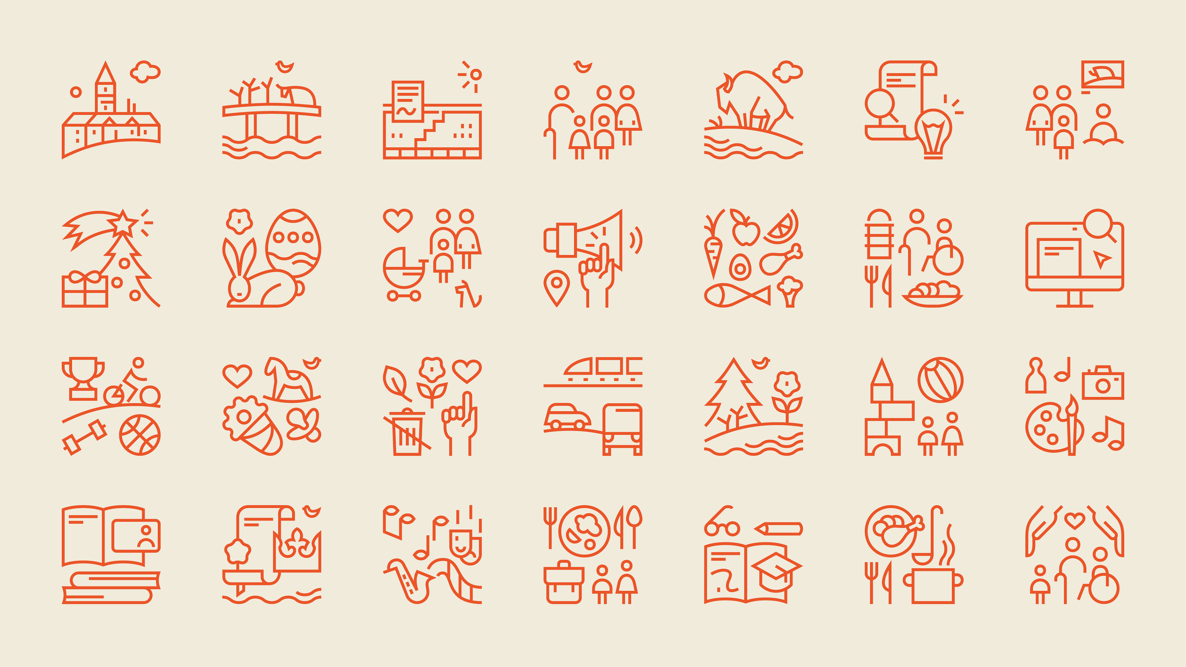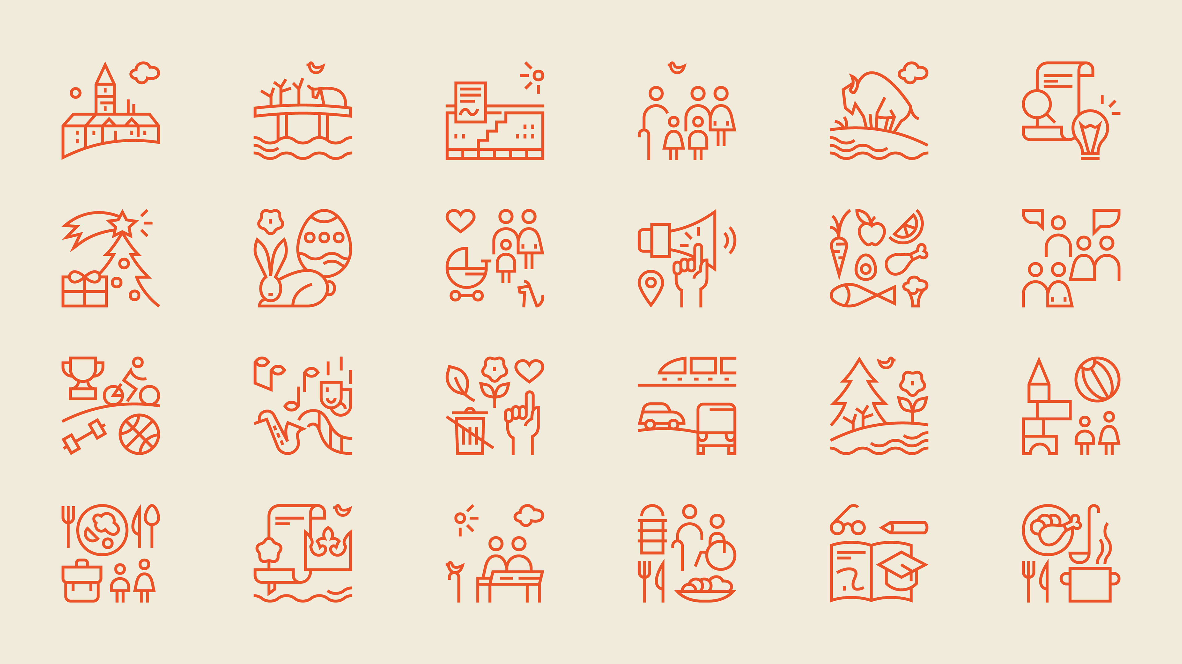 Vizuální identita reflektuje rovněž sport, dopravu či hudbu, klíčová témata města, skrze liniové motivy připomínající sportovní hřiště, křižovatky i notové zápisy. Součástí vizuální identity je sada autorských piktogramů — ilustrací.